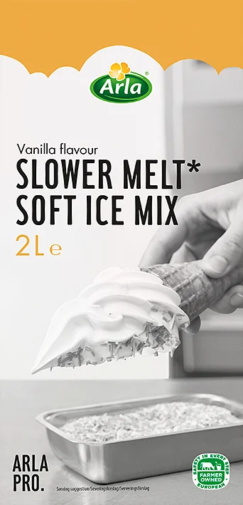 Løft din softice med den lækre Arla® Pro SLOWER MELT Softice mix. Udviklet af eksperter til at smelte langsommere, hvilket gør den perfekt til levering eller take-away – også på en varm sommerdag. Slower Melt tilbyder en cremet, velafbalanceret sødme og en klassisk vaniljesmag. Udviklet til professionelle softice-maskiner og stabil gennem pasteurisering, hvilket giver perfekte resultater hver gang.